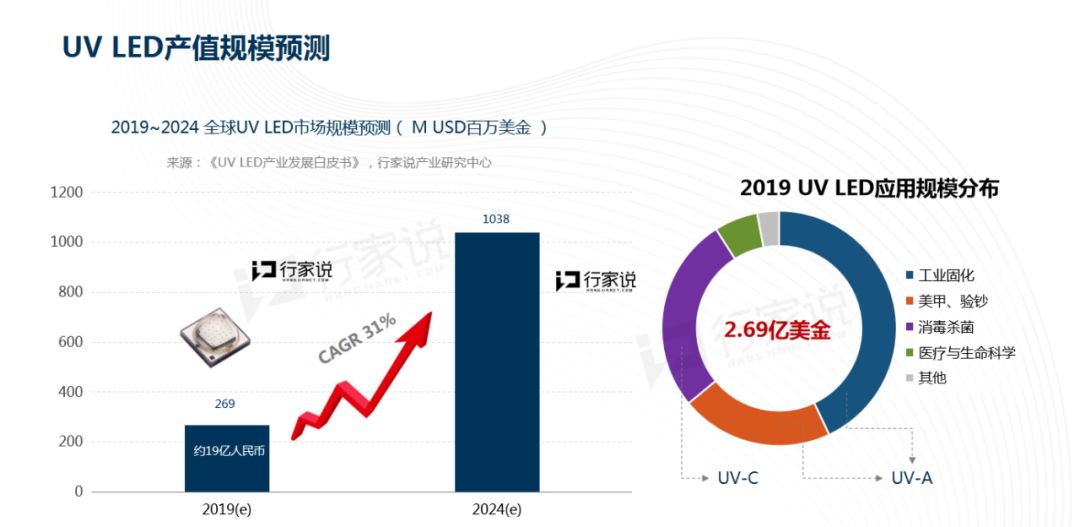 先不论此次疫情的背景下,根据行家说产业研究中心数据显示,2019年全球UV LED灯珠市场规模达2.69亿美元(约19亿人民币),2020年有望成为UV LED