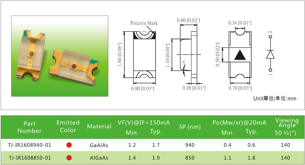 0603红外发射管波长分为850nm和940nm;因为850nm(工作时不可见光)发射功率大,照射的距离较远,所以主要用于红外监控器材上;而940nm(工作时不可见光,安卓手机摄像头可见)主要用于家电类的红外遥控器上。