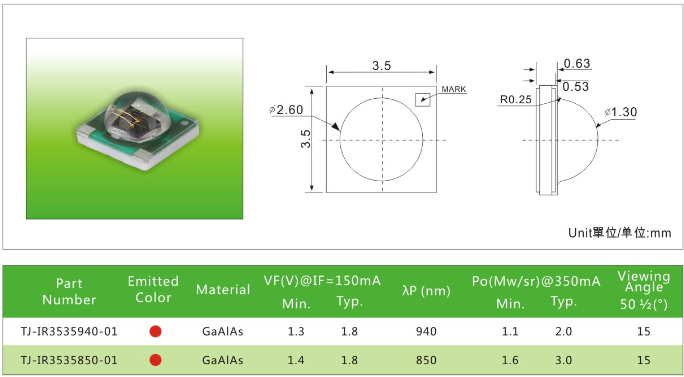 3535红外发射管波长分为850nm和940nm;因为850nm(工作时不可见光)发射功率大,照射的距离较远,所以主要用于红外监控器材上;而940nm(工作时不可见光,安卓手机摄像头可见)主要用于家电类的红外遥控器上。