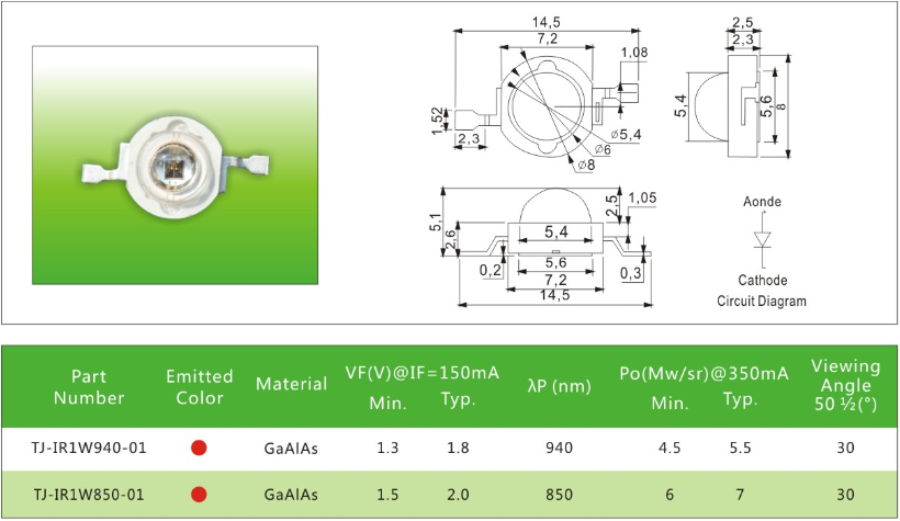 1W红外发射管波长分为850nm和940nm;因为850nm(工作时不可见光)发射功率大,照射的距离较远,所以主要用于红外监控器材上;而940nm(工作时不可见光,安卓手机摄像头可见)主要用于家电类的红外遥控器上。
