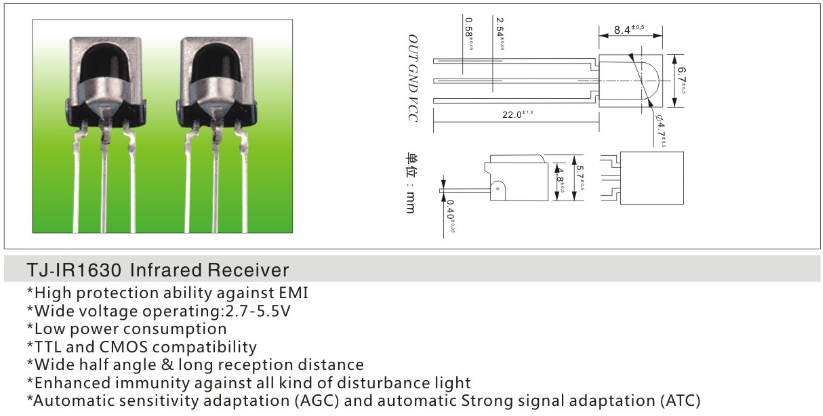 红外接收头1630应用于扫地机,打印机,门禁,扫描设备等电器数码产品。也可用于智能小车的寻线,避障及红外发射与接收的数据传输。