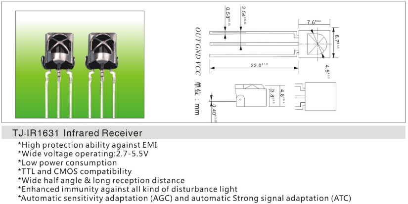红外接收头1631应用于扫地机,打印机,门禁,扫描设备等电器数码产品。也可用于智能小车的寻线,避障及红外发射与接收的数据传输。