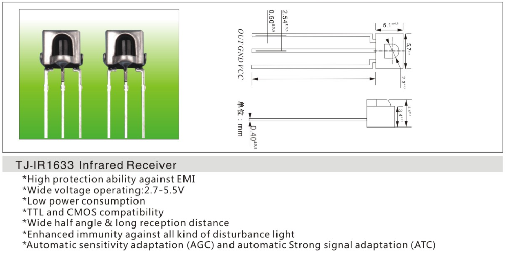 红外接收头1633应用于扫地机,打印机,门禁,扫描设备等电器数码产品。也可用于智能小车的寻线,避障及红外发射与接收的数据传输。