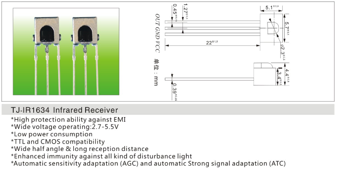 红外接收头1634应用于扫地机,打印机,门禁,扫描设备等电器数码产品。也可用于智能小车的寻线,避障及红外发射与接收的数据传输。