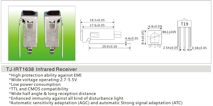 红外接收头1638应用于扫地机,打印机,门禁,扫描设备等电器数码产品。也可用于智能小车的寻线,避障及红外发射与接收的数据传输。