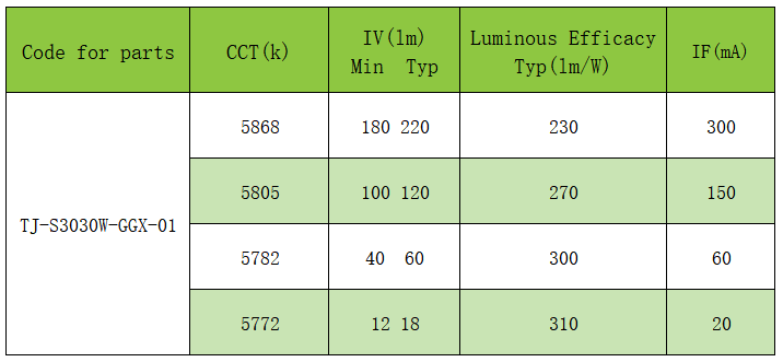 统佳3030高光效LED灯珠比传统光源更节能,广泛应用于商业和家庭照明。3030高光效led灯珠可达到光效200LM/W以上 (300MA测试),具体参数详询我司业务代表。