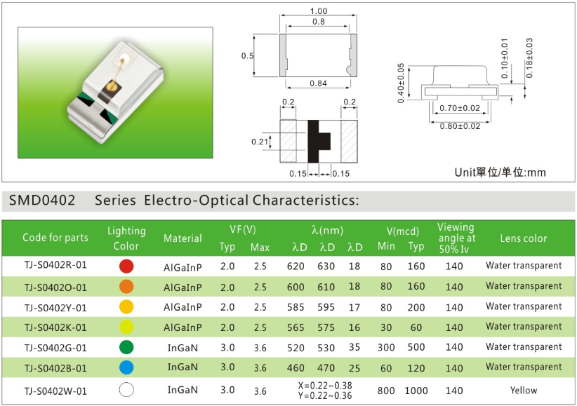 贴片0402单色led灯珠产品特征: