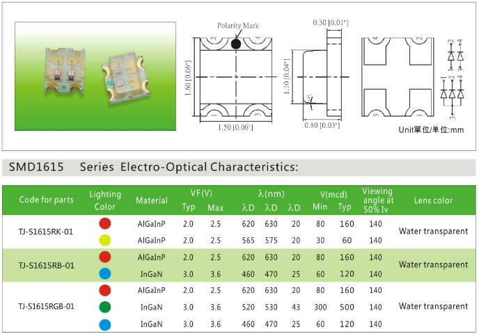 贴片1615全彩led灯珠产品特征:●功耗低●亮度高●低衰减●高效能●超长寿命●多种色彩可选择;可用于包含电子产品背光源、高端数码家电;指示灯如工业设备、智能家居、通讯设备、汽车内饰等。