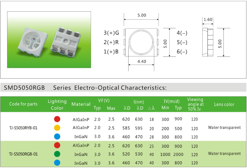 贴片5050RGB六脚led灯珠产品特征:●功耗低●亮度高●低衰减●高效能●超长寿命●多种色彩可选择;可用于包含电子产品背光源、高端数码家电;指示灯如工业设备、智能家居、通讯设备、汽车内饰等。