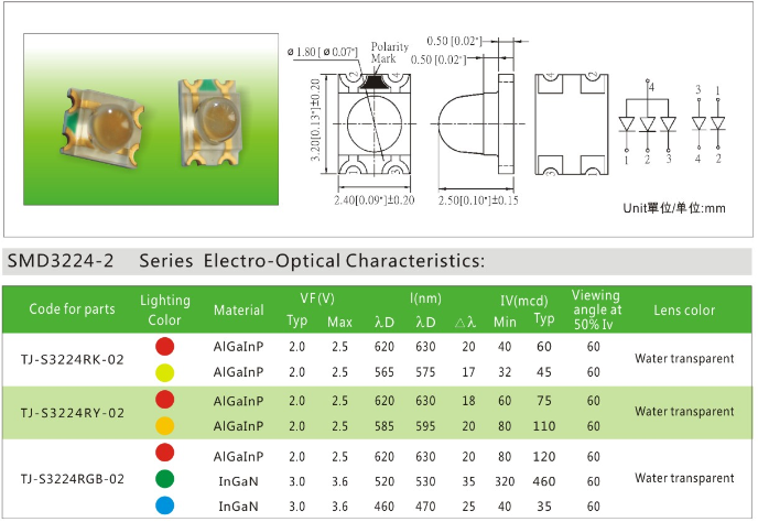 贴片3224双色带透镜led灯珠可用于电子产品背光源如手机、电脑周边及无人机等;信息指示如智能家居家器、通讯设备、高端数码、汽车电子内饰及工业与医疗设备等。
