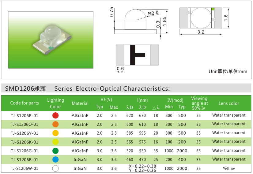 贴片1206球头led灯珠可以定制各种不同颜色的单色彩光和白光,波长和亮度可以根据需求定制!台湾统佳生产,晶元芯片