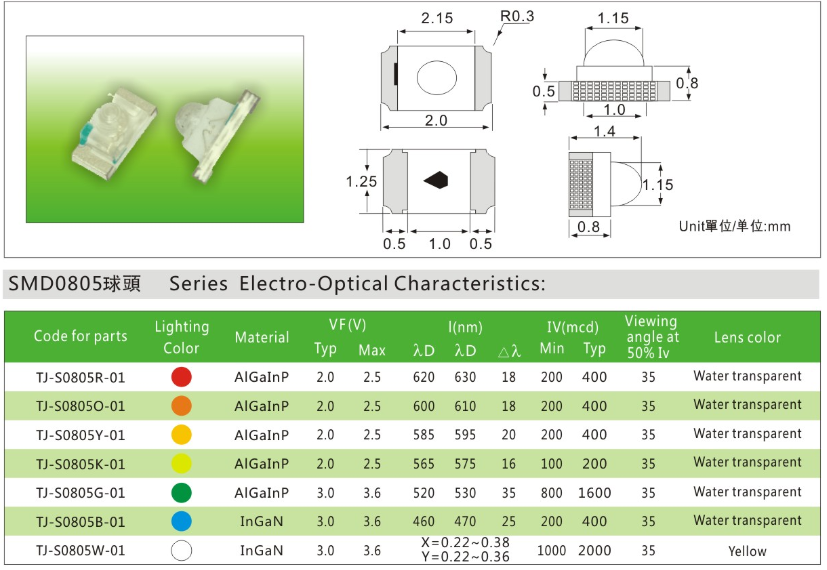 贴片0805球头led灯珠可以定制各种不同颜色的单色彩光和白光,波长和亮度可以根据需求定制!台湾统佳生产,晶元芯片
