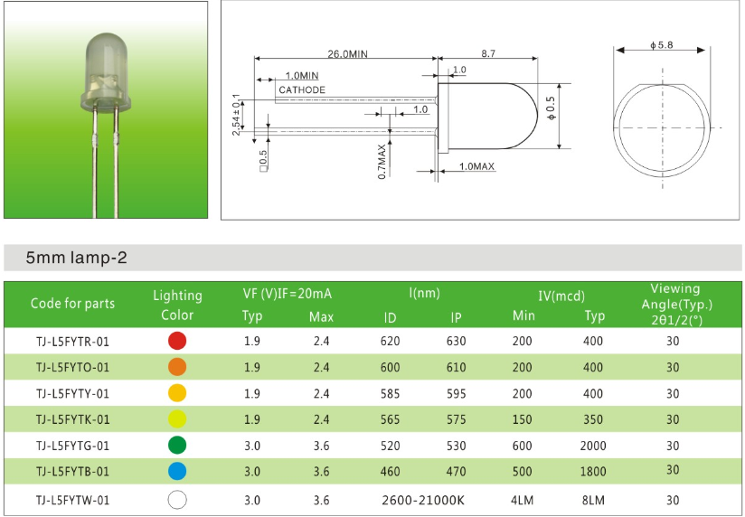 单色直插led灯珠5mm圆头产品应用:●背光模组应用●汽车内饰应用●高端数码应用●信号指示应用●智能家居应用●一般照明应用