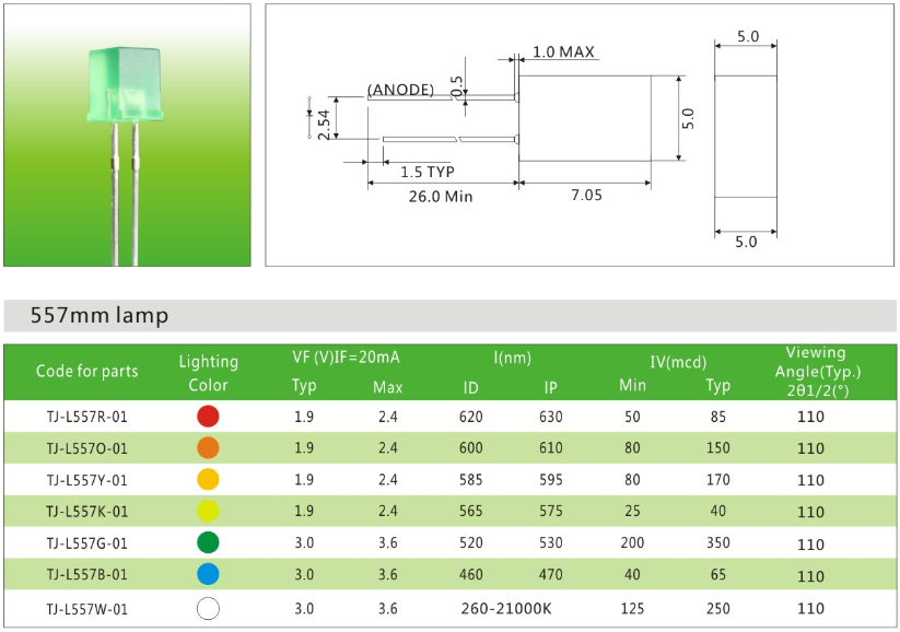 直插方形557led灯珠可以定制各种不同颜色的单色彩光和白光,波长和亮度可以根据需求定制!台湾统佳生产,晶元芯片 。