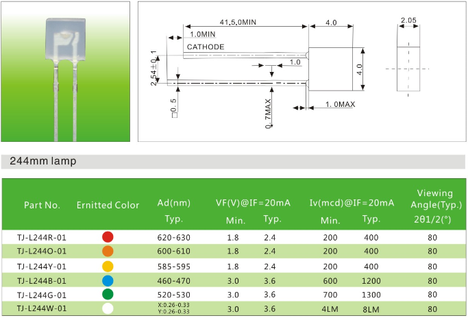 直插244方形led灯珠可以定制各种不同颜色的单色彩光和白光,波长和亮度可以根据需求定制!台湾统佳生产,晶元芯片 。