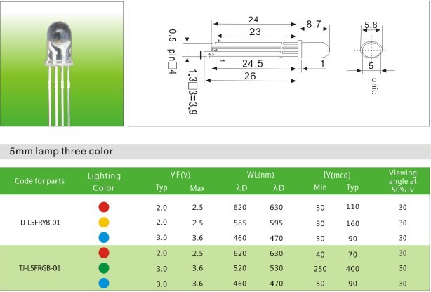 直插5mm圆头三色led灯珠可以定制各种不同颜色的彩光,波长和亮度可以根据需求定制!台湾统佳生产,晶元芯片