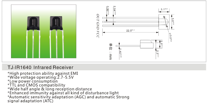 红外接收头1640应用于扫地机,打印机,门禁,扫描设备等电器数码产品。也可用于智能小车的寻线,避障及红外发射与接收的数据传输。