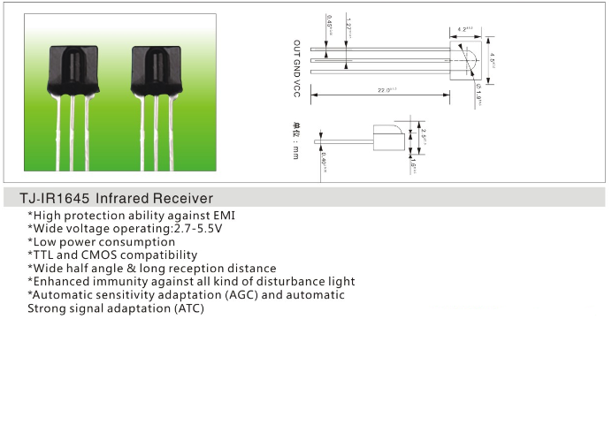 红外接收头1645应用于扫地机,打印机,门禁,扫描设备等电器数码产品。也可用于智能小车的寻线,避障及红外发射与接收的数据传输。