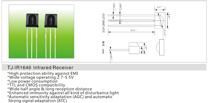 红外接收头1646应用于扫地机,打印机,门禁,扫描设备等电器数码产品。也可用于智能小车的寻线,避障及红外发射与接收的数据传输。