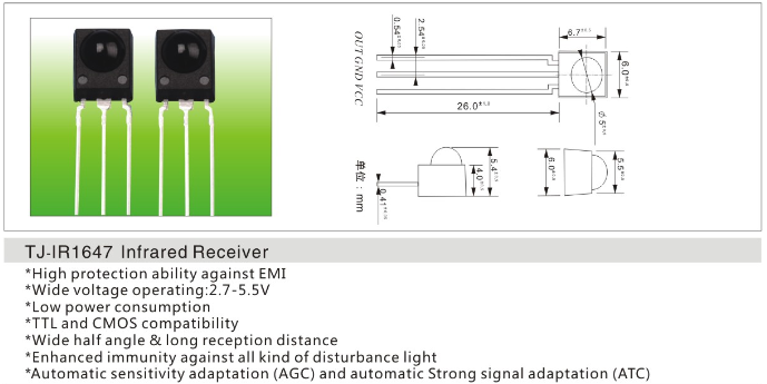 红外接收头1647应用于扫地机,打印机,门禁,扫描设备等电器数码产品。也可用于智能小车的寻线,避障及红外发射与接收的数据传输。