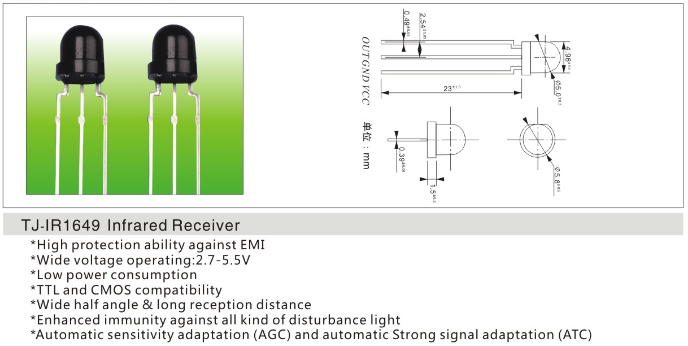 红外接收头1649应用于扫地机,打印机,门禁,扫描设备等电器数码产品。也可用于智能小车的寻线,避障及红外发射与接收的数据传输。