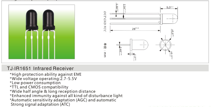 红外接收头1651应用于扫地机,打印机,门禁,扫描设备等电器数码产品。也可用于智能小车的寻线,避障及红外发射与接收的数据传输。