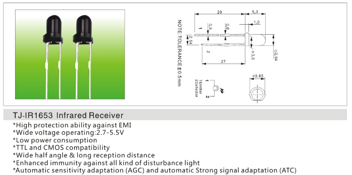 红外接收头1653应用于扫地机,打印机,门禁,扫描设备等电器数码产品。也可用于智能小车的寻线,避障及红外发射与接收的数据传输。